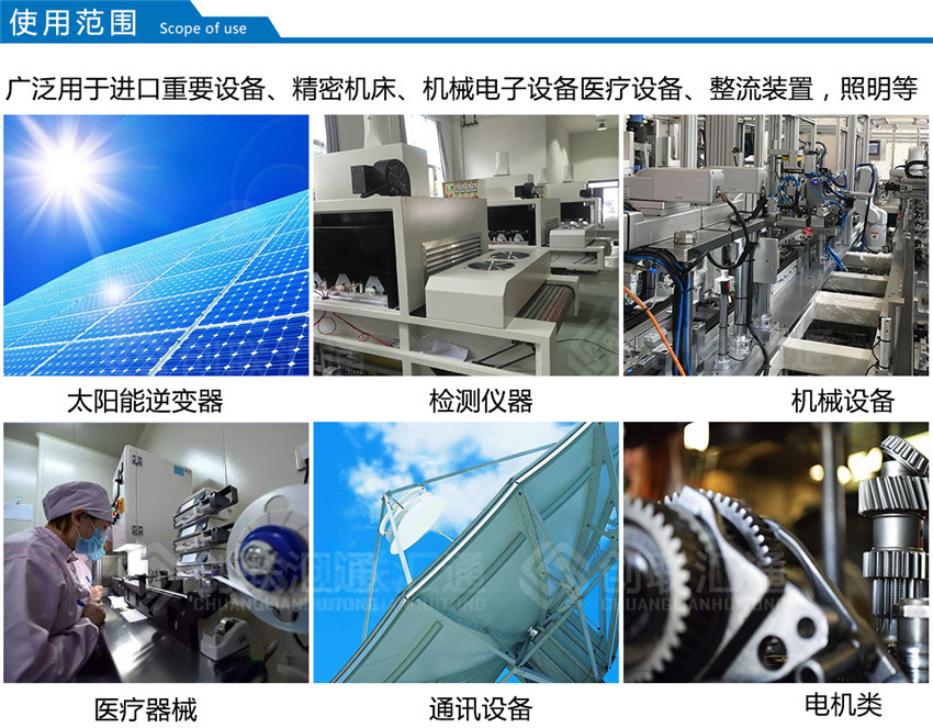 該系列隔離變壓器廣泛用于地鐵、高層建筑、機場、車站、印刷、機床、碼頭、光伏發(fā)電設備,逆變器專用,工礦企業(yè)及隧道的輸配電及進口設備的使用等場所